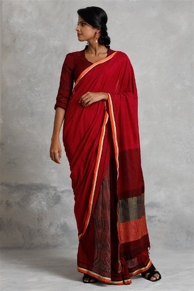This deep coloured saree is mixed with neon colours to give a modern look.? The saree is soft and drapes beautifully on your shoulders. This saree is suitable to wear for a special occasion at work and best worn with modern jewellery to complete the look. |